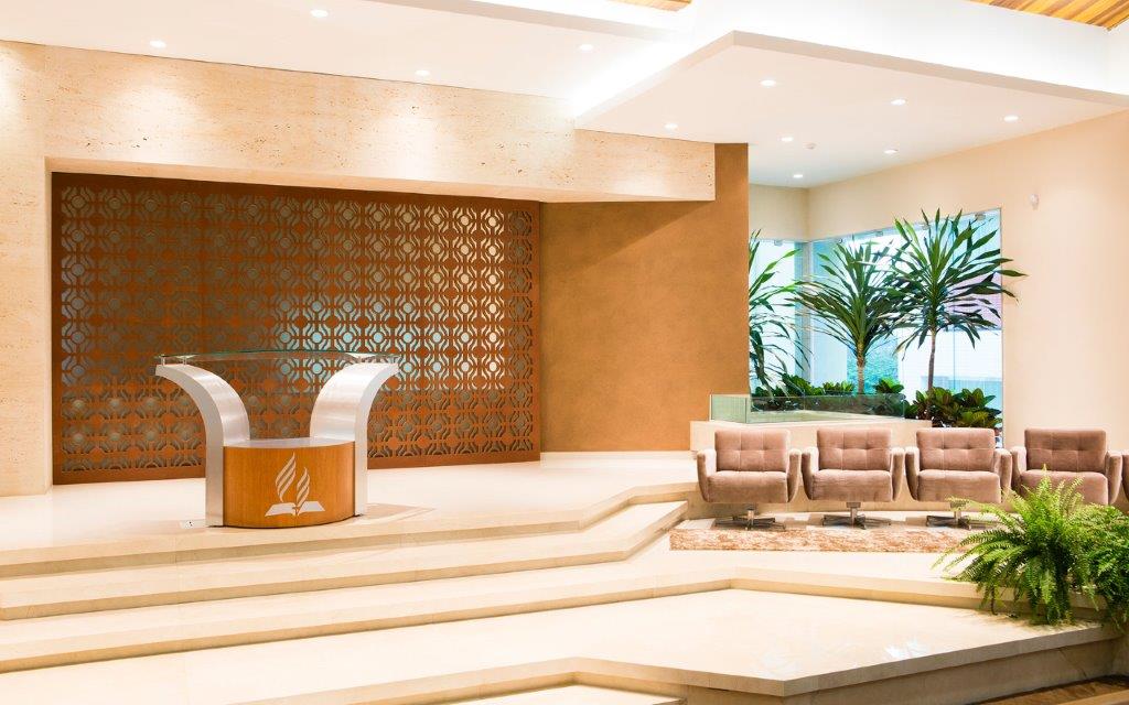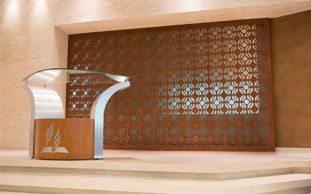Neste projeto, utilizamos o Valchromat castanho de 25mm para criar uma estrutura mais robusta, considerando o amplo ambiente do palco da igreja. Atrás do painel, foi instalado um vidro jateado, pelo qual os indivíduos passam após serem batizados. O ambiente resultante é bastante elegante, tornando este projeto particularmente especial.