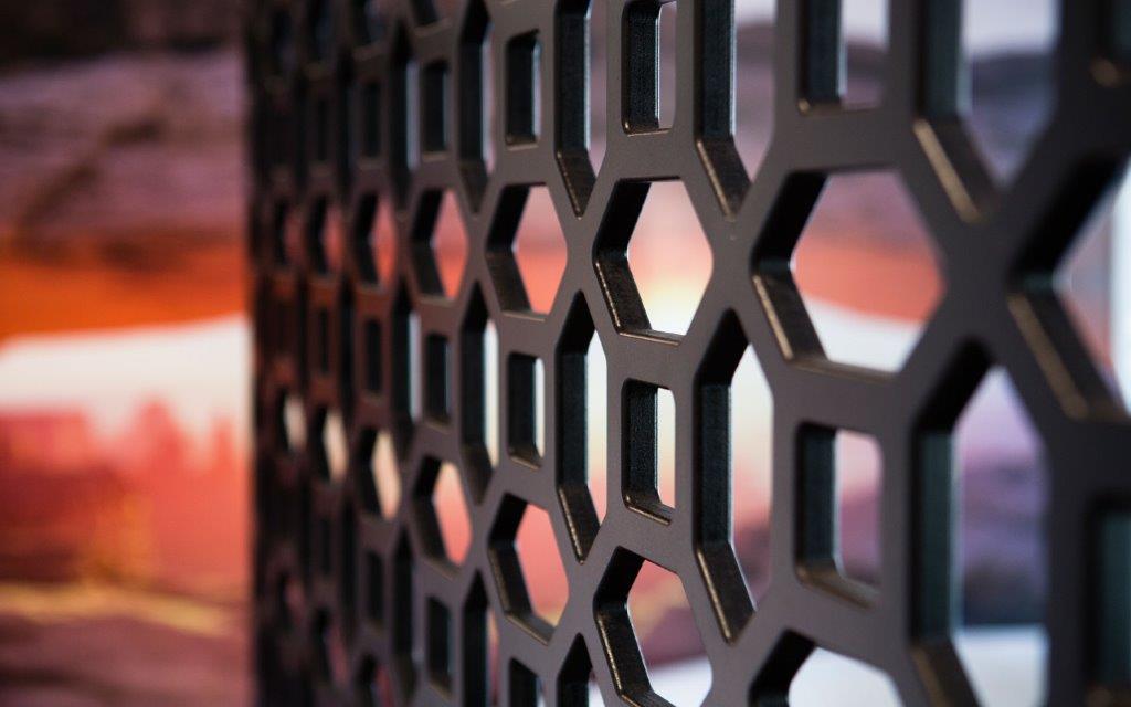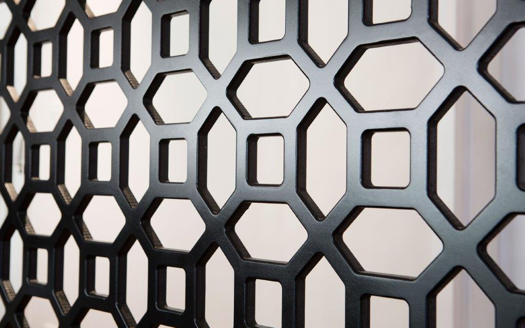 Painel executado em MDF Valchromat de 16mm instalado com perfil de alumínio anodizado preto.