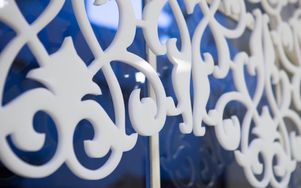 A Corte Recorte foi contratada para desenvolver um projeto em um salão de festas localizado em um prédio residencial. As principais necessidades do cliente eram a criação de uma peça decorativa que também reduzisse a incidência de luz solar no ambiente interno. Em resposta, a Corte Recorte projetou e fabricou peças decorativas em polietileno de alta densidade (PEAD) branco, que se encaixam perfeitamente nas janelas arredondadas do salão. O resultado final é um projeto excepcional.