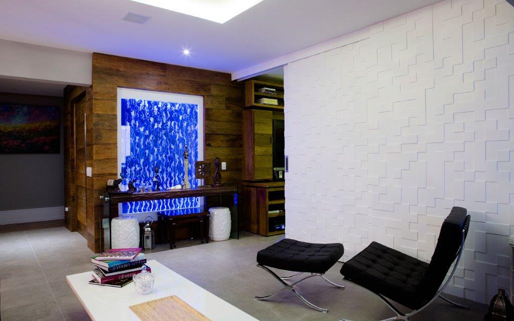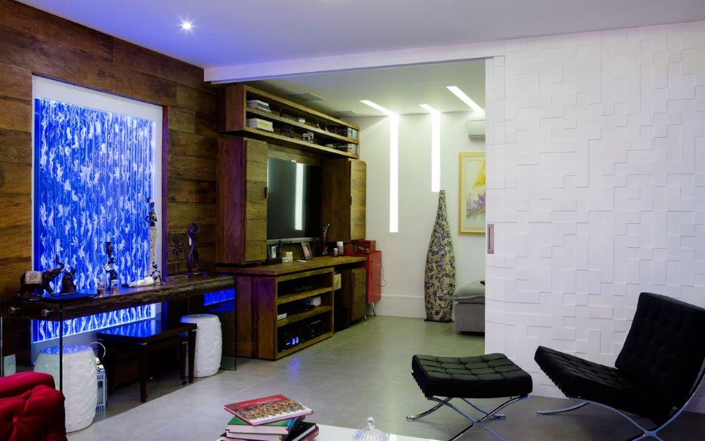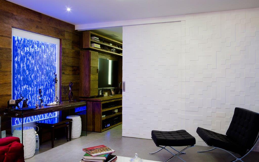 Esta porta foi projetada para isolar o ambiente do home theater da sala, proporcionando um ambiente mais aconchegante e silencioso. Fabricada em MDF de alta resistência e laqueada em branco, utiliza um sistema de abertura facilitada, composto por três folhas: uma fixa e duas móveis, que deslizam suavemente.